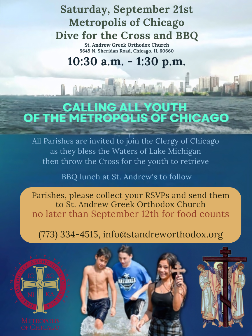 St. Andrew Greek Orthodox Church (Chicago, IL) Open to all JOY, JR. GOYA, GOYA, & Sunday School students to participate in the Blessing of the Waters of Lake Michigan and to dive for the Cross! Please RSVP to the Office by Tue, Sept. 10.