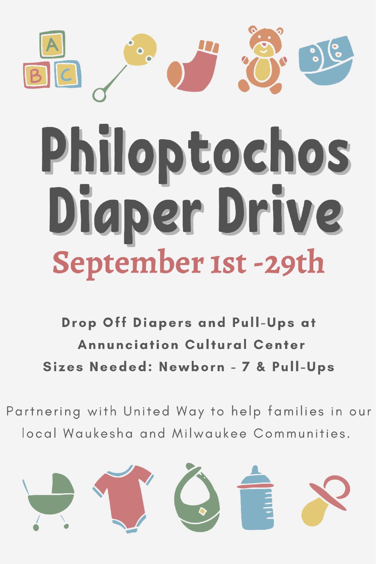 DIAPER DRIVE --- Sept. 1 – 29 --- Philoptochos is hosting a Diaper Drive benefiting families in Milwaukee and Waukesha counties. Your contributions are helping stock the United Way Diaper Bank. Diapers can be dropped off between September 1st and September 29th at the Cultural Center. See flyer for more details.