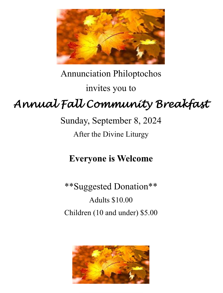 ANNUAL FALL COMMUNITY BREAKFAST --- Sun, Sept. 8 after the Divine Liturgy