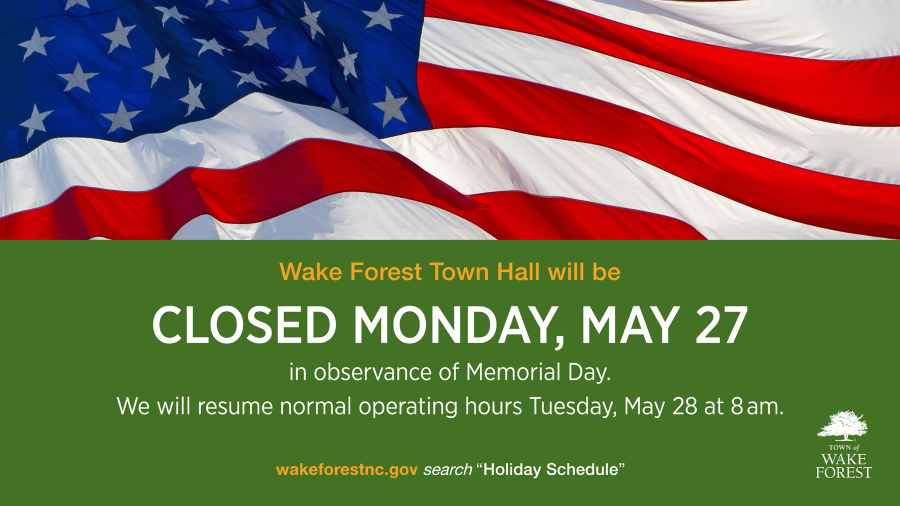 The Wake Forest Town Hall and other administrative offices will be closed Monday, May 27, in observance of Memorial Day.