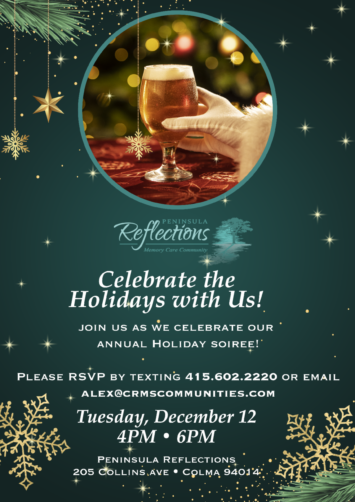 Dec 12 - Celebrate the Holidays with Us, 4pm, Peninsula Reflections, 205 Collins Ave, Colma, 94014, RSVP