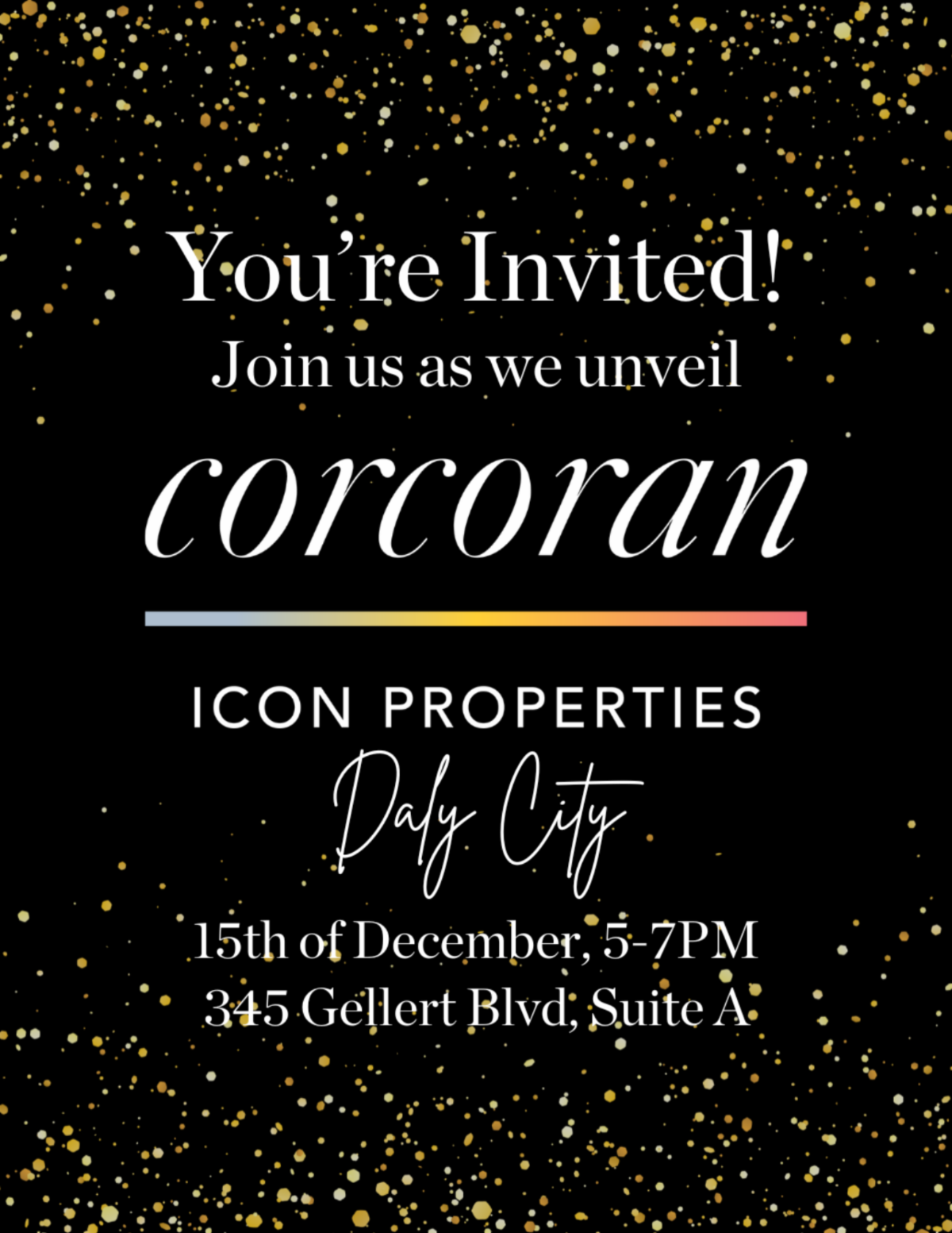 - Dec 15 - Corcoran Icon Properties, Ribbon Cutting, 5pm, 345-A Gellert Blvd, Daly City 94015, All invited to attend.