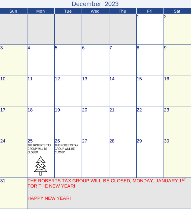 The Roberts Tax Group will be closed Monday, December 25th, and Tuesday December 26th for Christmas.