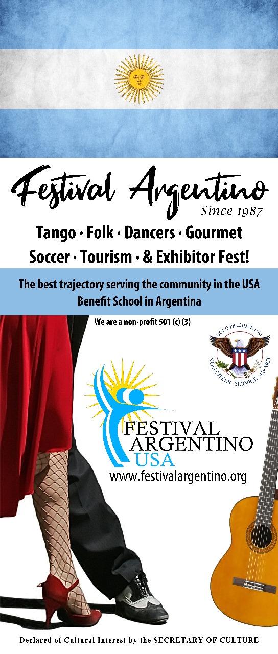 The Festival will include a stage with details made by Argentines that allow a better view of the different regions of the nation's music, culture, tango, and more. We have ads, booths available for sale at a low cost! Ads, Sponsorship & Booth. info@festivalargentinousa.com