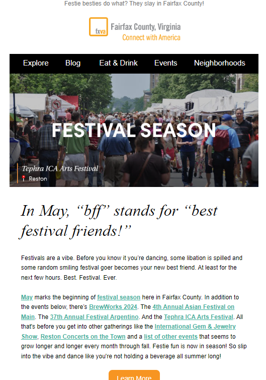 En mayo, "bff" significa "mejores amigos de festival". Mayo marca el comienzo de la temporada de festivales aquí en el Condado de Fairfax. Además de los eventos a continuación, está BrewWorks 2024.