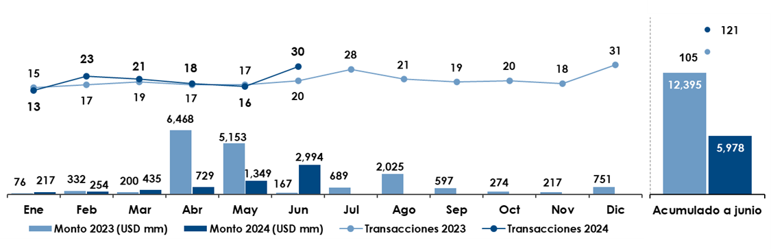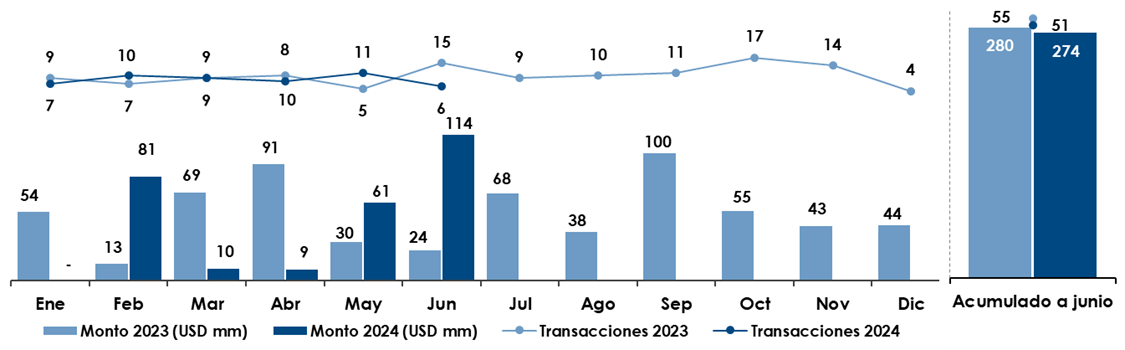 En cuanto al volumen de transacciones acumuladas, se han reportado cuatro menos respecto a las existentes a estas alturas del año anterior, al pasar de 55 a 51. Respecto al monto acumulado, se produjo un decremento de 2.1%, al bajar de USD 280 millones en 2023 a USD 274 millones en 2024.