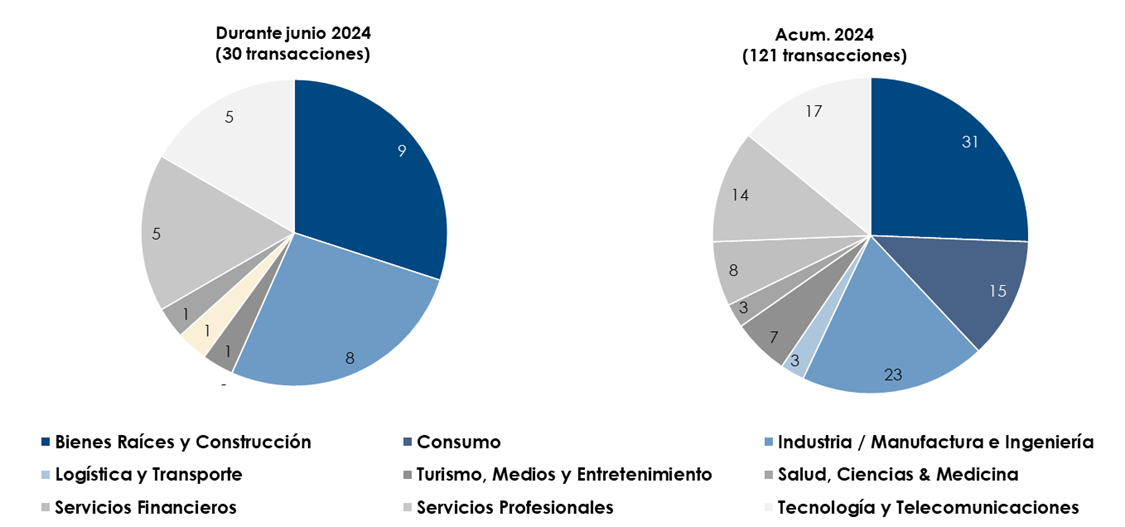 Durante el sexto mes de 2024, el sector más activo en cuestión de fusiones y adquisiciones fue el de Bienes Raíces y Construcción, con un total de 9 transacciones, equivalentes al 30% del total de las operaciones reportadas.