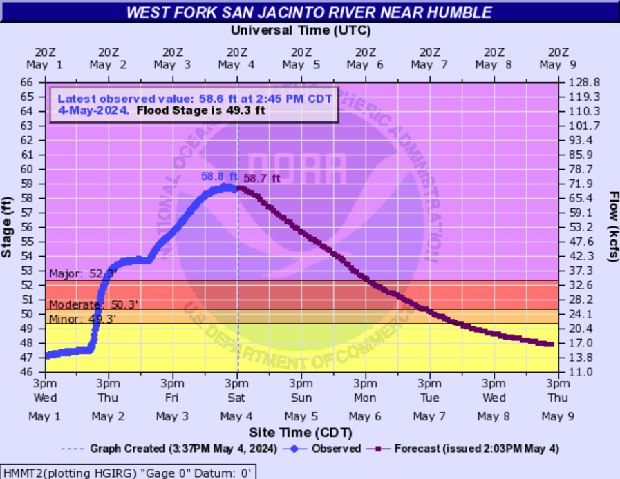 The West Fork of the San Jacinto River crested this afternoon at 58.8 feet which is almost 3 feet lower than anticipated. There are areas south of Kingwood Drive (Kingwood Lakes, Town Center, Kingwood Greens, Barrington, Deer Ridge Estates, Forest Cove) that are experiencing high waters due to backflow from the channels and river through the storm sewers. Along Hamblen Road and south of Hamblen Road there are still extensive flood waters. These waters are receding and will continue receding into the night.