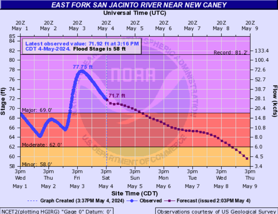 Lake Conroe: Lake Conroe is currently at 202.6 feet (normal pool is 201 feet). The San Jacinto River Authority is currently releasing 18,955 cfs. Lake Conroe levels can be monitored here.