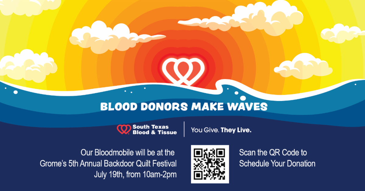 Visit the Grome's Vendor and Craft Fair on July 19th & 20th from 10am-3pm! Grab a Vendor Passport and explore the talent of your community as local artisans and small businesses display their crafts and creations for you to shop! Visit each booth to collect a stamp and when completed, head inside to receive a prize and enter into a raffle to win a gift basket containing a handmade item from each booth! Plus enjoy food and drink from local food trucks! In addition to this amazing opportunity to support your local community, take a moment to give back with South Texas Blood & Tissue in their Bloodmobile which will be parked in our parking lot on Friday from 10am-2pm. This is a great community event that you won't want to miss! | |