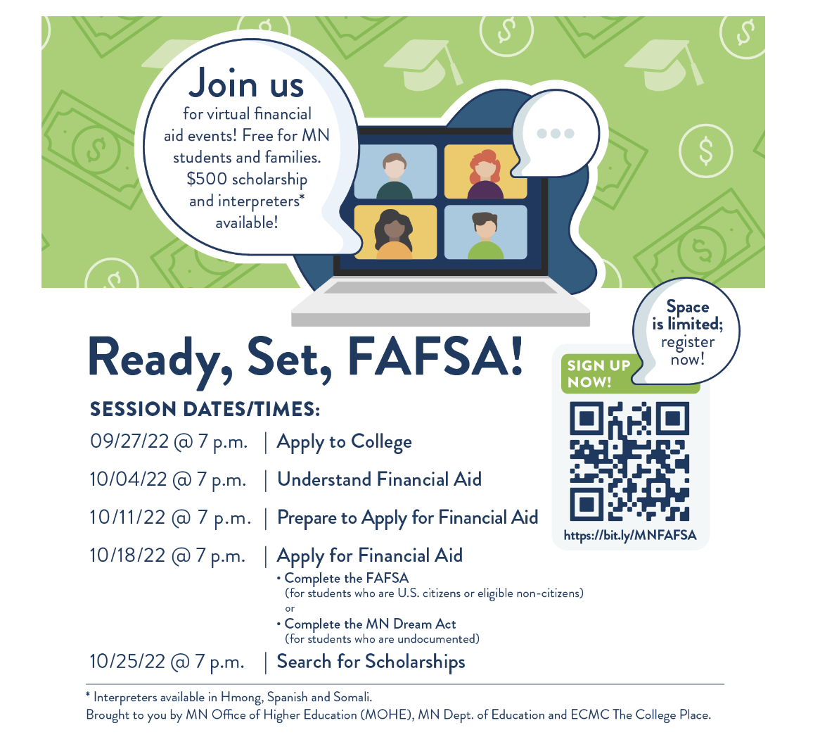 Need help understanding the college application process and financial aid options for college? Attend free virtual sessions for high school students and families offered by a collaborative of financial aid experts starting September 27. All sessions will have interpretation in Spanish, Somali and Hmong.