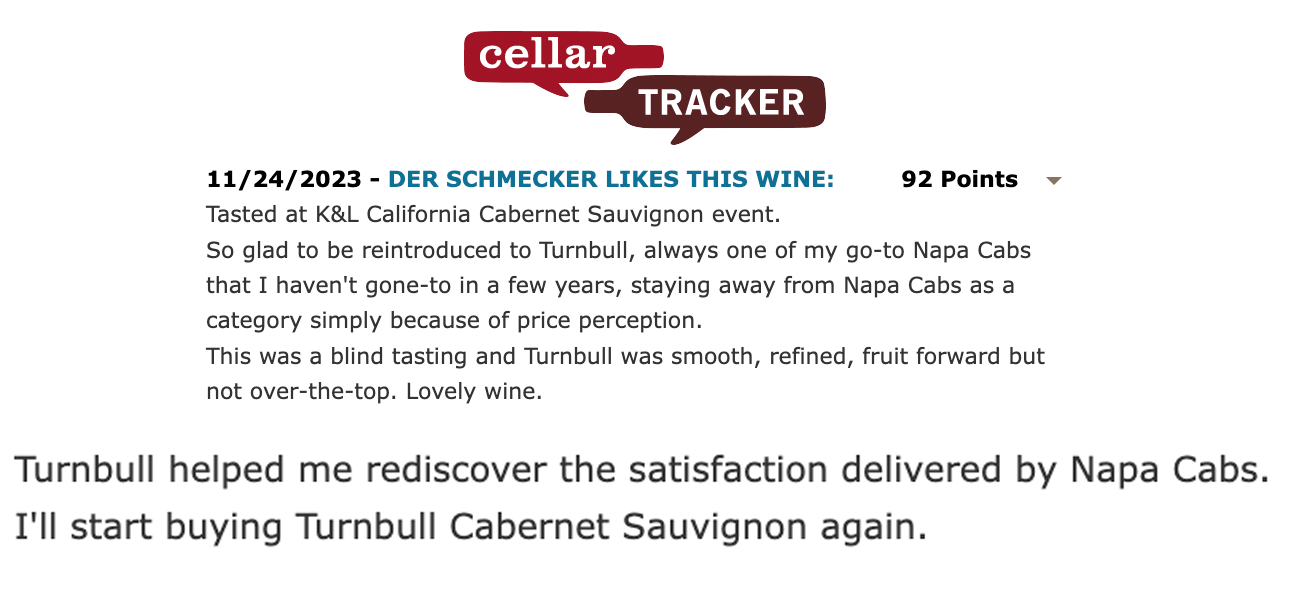 "The 2021 Napa Valley Cabernet from Turnbull is fantastic. It opens to perfumed aromatics of dark cherries and plums which are woven together with fresh cut flowers, toasted spices, tobacco and hints of dusted cocoa nuances all taking shape in the glass. On the palate this is continues to impress with its gorgeous velvety texture and beautifully polished, nicely integrated tannins, which lead up to the long finish. This certainly has the potential to evolve for a decade or longer, however it is already quite appealing in its youth."