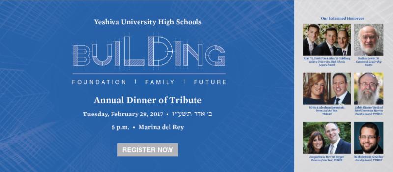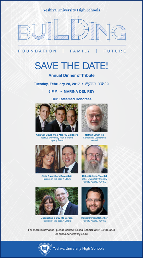 Join Us at our Annual Dinner of Tribute when we celebrate the past and the future of Yeshiva University High Schools. For more information, to join the scroll of honor and/or to register, visit
