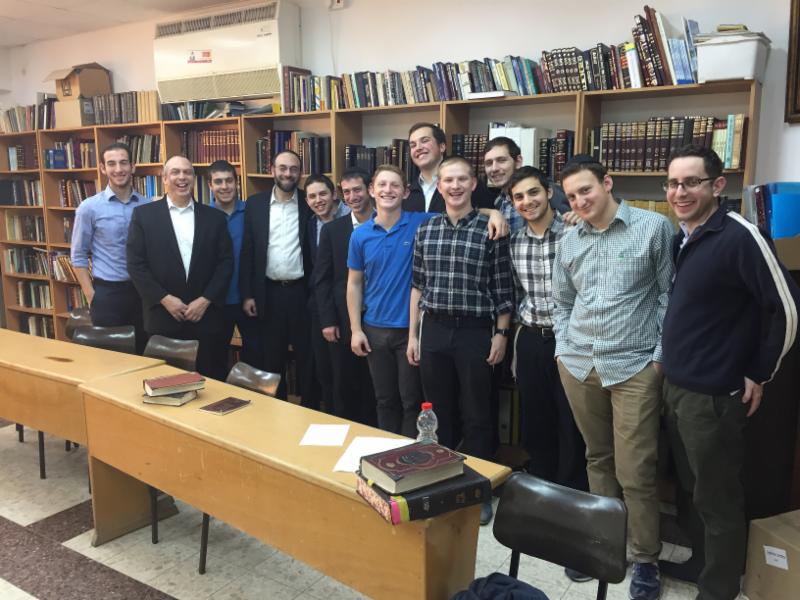 Rabbi Kahn, center, along with Rabbi Taubes, Rabbi Shulman and Shuey Jacoby, visit with young alumni currently studying in Yeshivat Sha'alvim