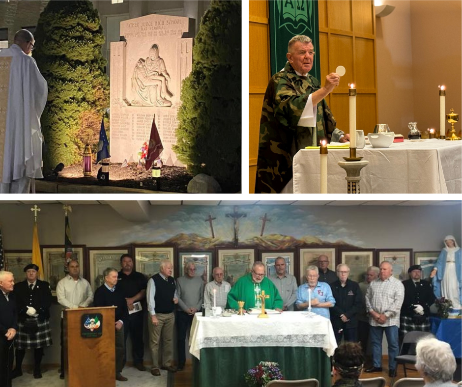 | Top Left: Fr. Vince Smith, OSFS, celebrated a Memorial Mass for All the Faithful Departed from Fr. Judge High School (Philadelphia). This included a tribute to the 27 graduates who were killed in the Vietnam War. Top Right: Fr. Jim MacNew, OSFS, celebrated Veterans Mass with Salesianum Alumni Veterans (Wilmington, DE). Bottom: Fr. Joe Campellone, OSFS, celebrated with veterans at AOH Div 39 (Philadelphia, PA.) | |