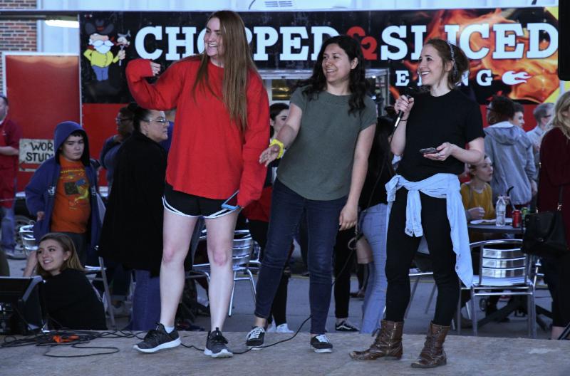 Co-Director Christie Connolly (on mic) playing improv games at First Friday Art Trail. Photo by Dóri Bosnyák |