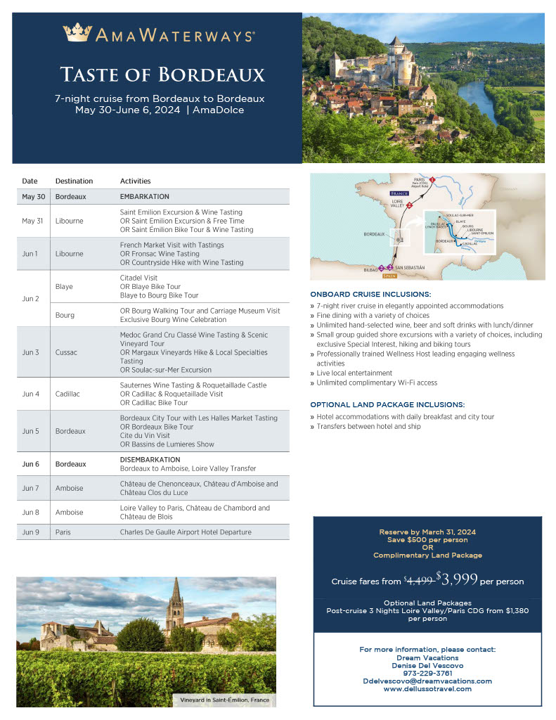 Join us for an AMA River Cruises! Embark on a journey through the stunning Bordeaux region with our "Taste of Bordeaux" cruise, followed by a post-land package to enhance your experience. Starting at only $3999.00 per person! This unforgettable trip includes: 7-night cruise aboard the luxurious AMA DOLCE Visits to picturesque vineyards and wine tastings Excursions to charming villages and historic landmarks Delicious onboard dining featuring local flavors And more! Don't miss this incredible opportunity to explore Bordeaux in style. Book now and create memories to last a lifetime.