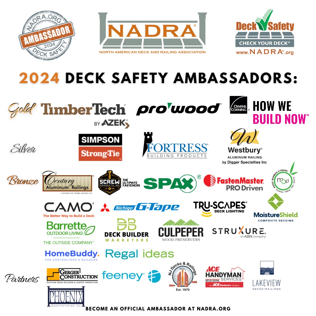 Click HERE to receive the official 2024 Deck Safety Ambassador Badge. Benefit packages are highlighted on the registration page with logos remaining on the website all year long.