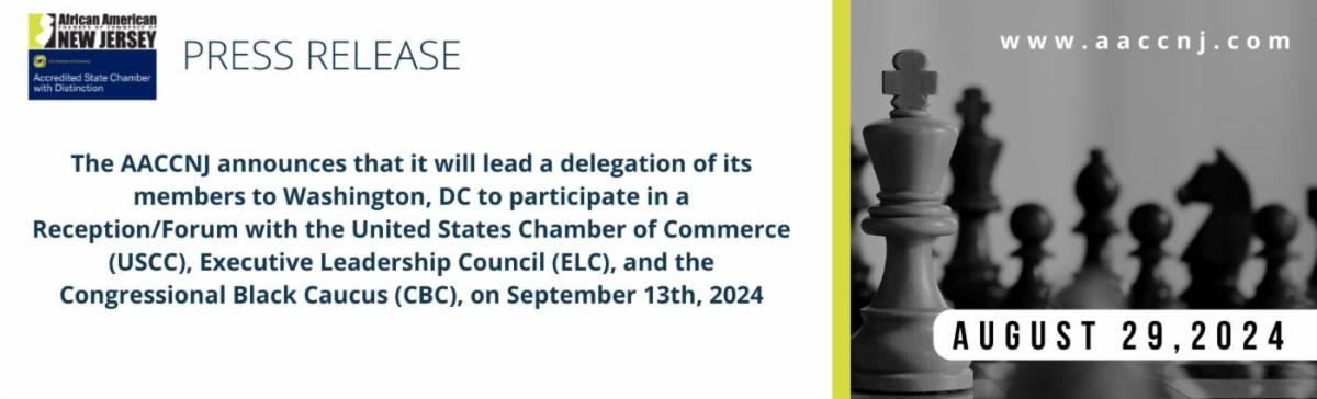 Trenton, NJ, August 29, 2024. The African American Chamber of Commerce of New Jersey (AACCNJ) announces that it will lead a delegation of its members to Washington, DC to participate in a Reception/Forum with the United States Chamber of Commerce (USCC), Executive Leadership Council (ELC), and the Congressional Black Caucus (CBC), on September 13th, 2024.