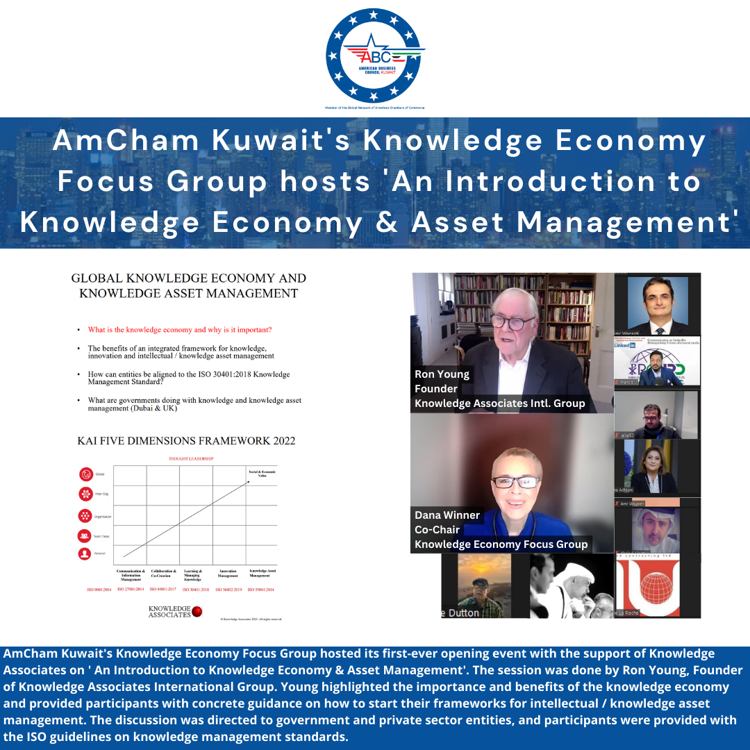March 8: AmCham Kuwait's Knowledge Economy Focus Group hosted its first-ever opening event with the support of Knowledge Associates on ' An Introduction to Knowledge Economy & Asset Management'. The session was done by Ron Young, Founder of Knowledge Associates International Group. Young highlighted the importance and benefits of the knowledge economy and provided participants with concrete guidance on how to start their frameworks for intellectual / knowledge asset management. The discussion was directed to government and private sector entities, and participants were provided with the ISO guidelines on knowledge management standards. Read more | | |