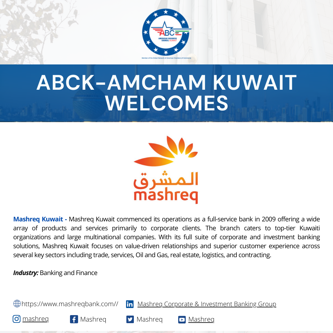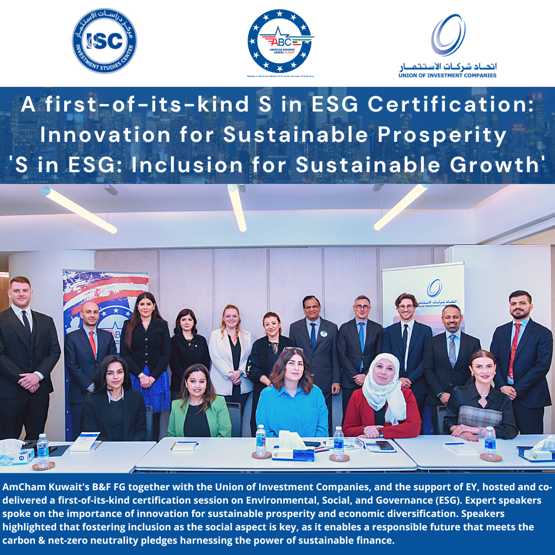 March 6: AmCham Kuwait's B&F FG together with the Union of Investment Companies, and the support of EY, hosted and co-delivered a first-of-its-kind certification session on Environmental, Social, and Governance (ESG). Read more | | |