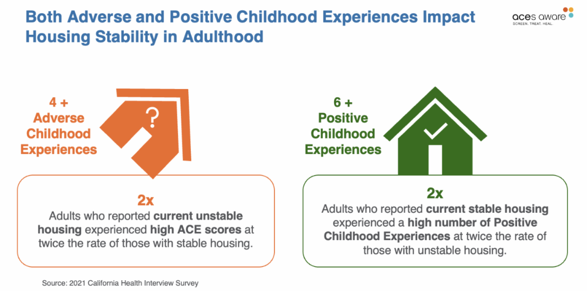 Recent data from the 2021 California Health Interview Survey (CHIS) also makes a connection between ACEs – as well as Positive Childhood Experiences – and housing instability.
