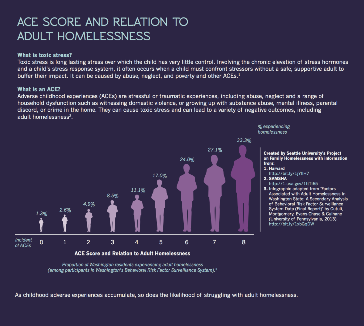 Studies have shown that having ACEs is linked to a risk of homelessness and housing instability in adulthood. As shown in this infographic, the higher the ACEs, the greater the risk of adult homelessness.
