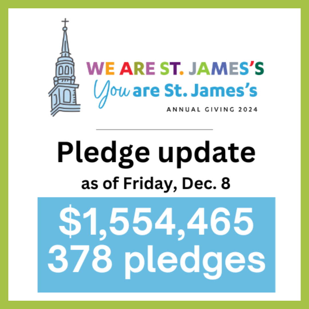 If you haven't yet made your pledge, now is a great time. We are 86% of the way to our goal of $1.8 million, and we'd like to be at or near our goal this Sunday. If you're not quite ready, please remember to make your pledge for 2024 before December 31st to help our Vestry plan for the coming year. Thank you!