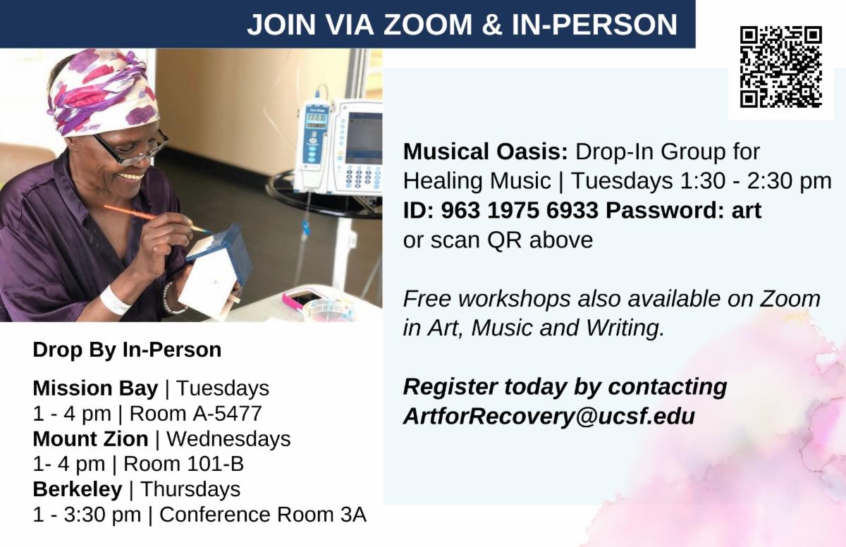 Being an artist my entire life I never saw a future for myself in medicine. However, 20 years ago when I came to UCSF with a friend and saw my language of artmaking offered to patients, as a way to help them heal, I knew I was home. Cindy Perlis, founder of Art for Recovery, took a chance on me 20 years ago and has taught me the art of holding safe space for people dealing with cancer and life-threatening illness in the UCSF Medical Center. In Art for Recovery, we see a lot of beautiful art, music, and writing, however this beauty also comes with a lot of pain, grief, and death. It is an honor to hold space for all of it and there is no way that I could carry the weight of this work without my incredible team. Ned Buskirk, Elias Medici, Patrice Haan, Mary Watson, Jim Murdoch, Josh Martin, and Cindy Perlis are the incredible artist that support me and all the patients we serve. We have a saying in art for recovery that, 'our patients are our teachers.'