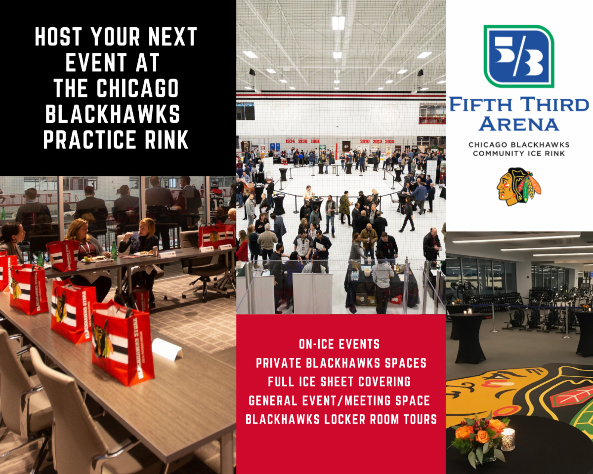 Host your event at Fifth Third Arena with exclusive access and unique covered ice opportunities. The Fifth Third Arena offers the opportunity to host events from birthday parties to corporate events. The practice home of the Chicago Blackhawks offers covered ice events for up to 1000 people. A normal ice rink can be transformed into an upscale venue or a large space for trade shows and expos. Make use of the Blackhawks private space at Fifth Third Arena by hosting events for up to 200 people. The Blackhawks private gym, Hockey Operations Suite, and Rooftop Deck all make unforgettable backdrops to any event. Follow the link below to see spaces and event options or to inquire about hosting your event at Fifth Third Arena.