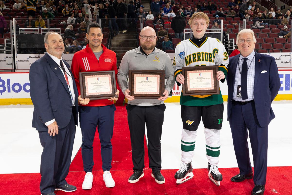 Pictured from left to right: Jack Weinberg, AHAI High School Chairperson, Jonathan Cannizzo, Coach of the Year, Chicago Hawks; Joe Montagano, High School Coach of the Year, Lincoln Way; Even Ziegler, High School Player of the Year, Waubonsie; Kevin Bolger, AHAI President