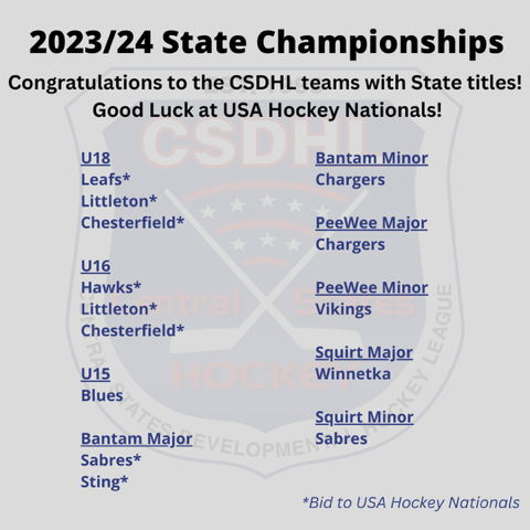Congratulations to the CSDHL teams with State titles and to the U18 Leafs, U16 Hawks and the U14 Sabres who will be representing Tier II Illinois at the USA Hockey National Championships.