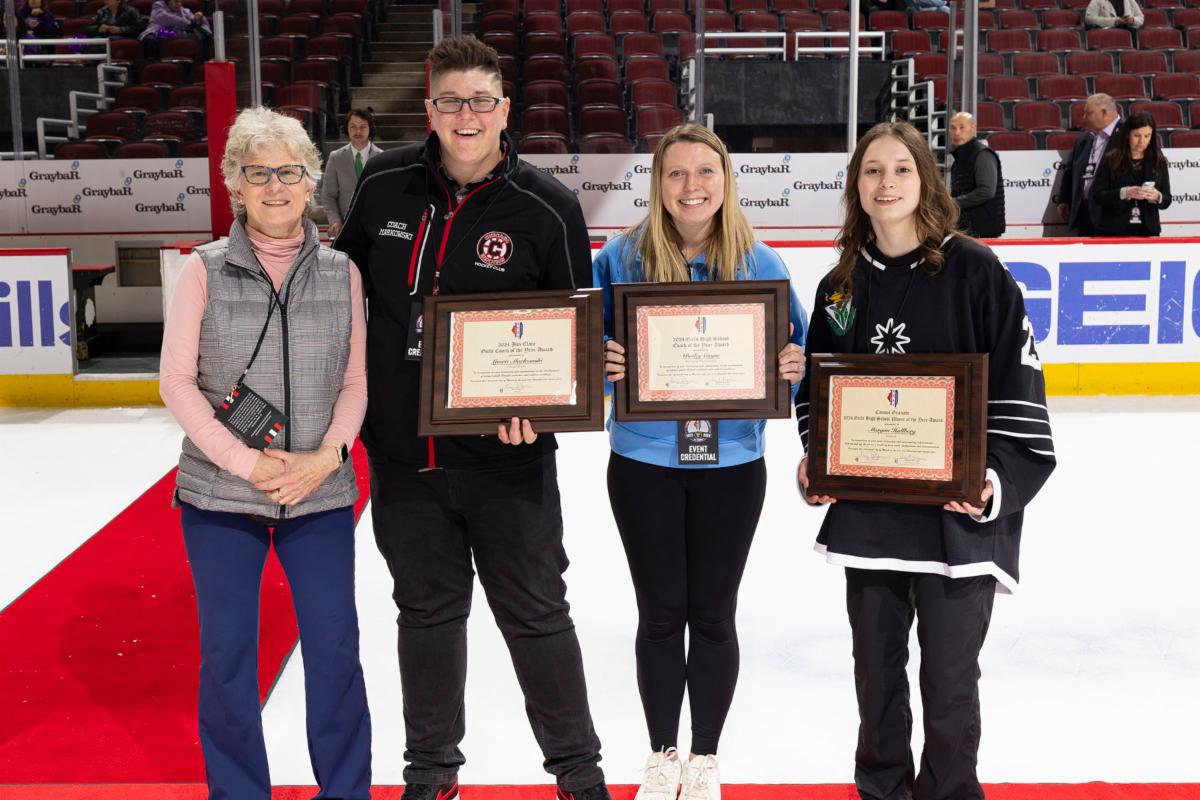 Pictured from left to right: Jenny MacDougall, AHAI Girls High School Chairperson, Laurie Markowski, Girls Coach of the Year, Chicago Bruins; Bailey Coyne, Girls High School Coach of the Year, Burlington Grizzlies; Morgan Hallberg, Girls High School Player of the Year, Fenwick | |