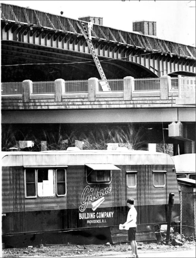 This top photo, from the Hartford History Project of the Hartford Public Library, taken July 21st 1964, shows the I-84 viaduct being completed. The construction trailer at the bottom of the photo identifies the Gilbane Building Co. as at least one of the contractor working on the project.