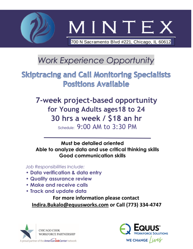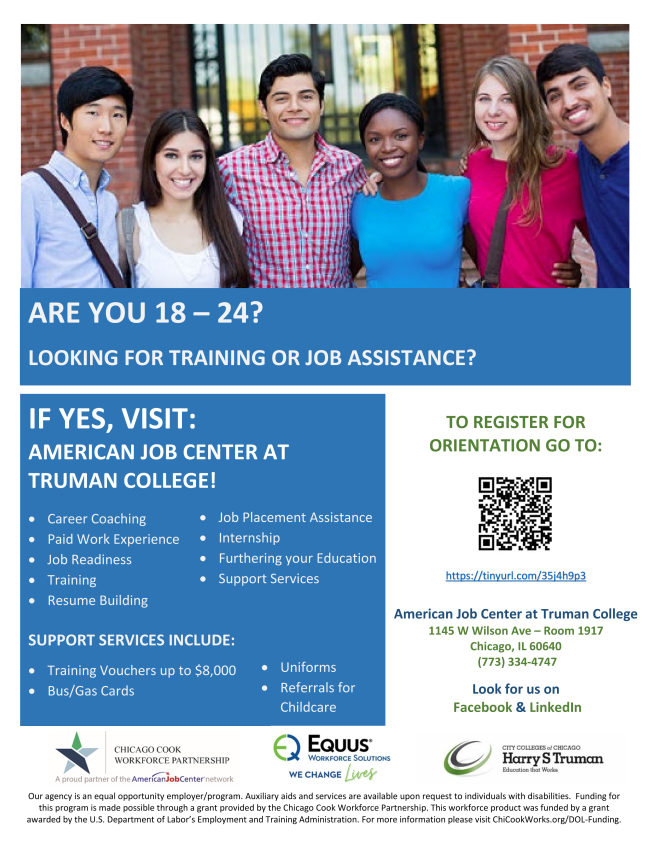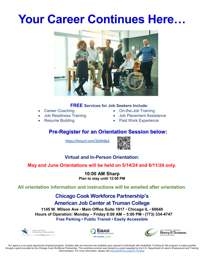 The Illinois workNet® Center System, an American Job Center, is an equal opportunity employer/program. Auxiliary aids and services are available upon request to individuals with disabilities. All voice telephone numbers may be reached by persons using TTY/TDD equipment by calling TTY (800) 526-0844 or 711. This workforce product was funded by a grant awarded by the U.S. Department of Labor’s Employment and Training Administration. For more information please refer to the footer at the bottom of any webpage at illinoisworknet.com.
