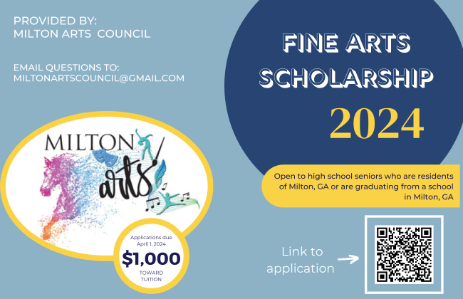 Milton Arts Council is proud to once again offer The Hogan Family Fine Arts Scholarship in 2024! This scholarship is open to all high school seniors who are residents of or are graduating from a school in Milton, GA. The student must be attending an accredited college or university and majoring in an area of the arts.