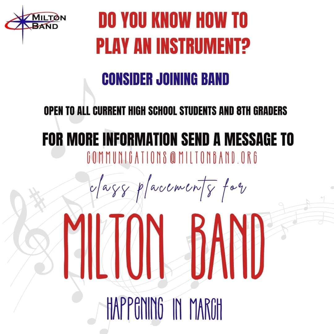 Milton Band has room in our ensembles for any 8th grade or high school student that knows how to play an instrument! Stop in to see the Director of Bands, or email communications@miltonband.org if you have interest in learning more. Come and make music with us! | |