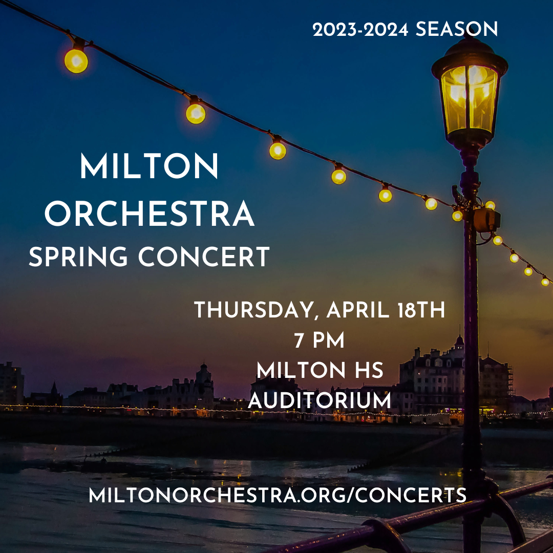 Enjoy film score selections, popular classical music, Symphony Orchestra with Milton Band guests, and performances by two featured senior orchestra soloists, Ella Grace Malcom and Connor Oneacre! Milton Orchestra's Spring Concert is Thursday, April 18th at 7:00PM. Admission is free, but visit miltonorchestra.org/concerts to reserve seats in advance. | |