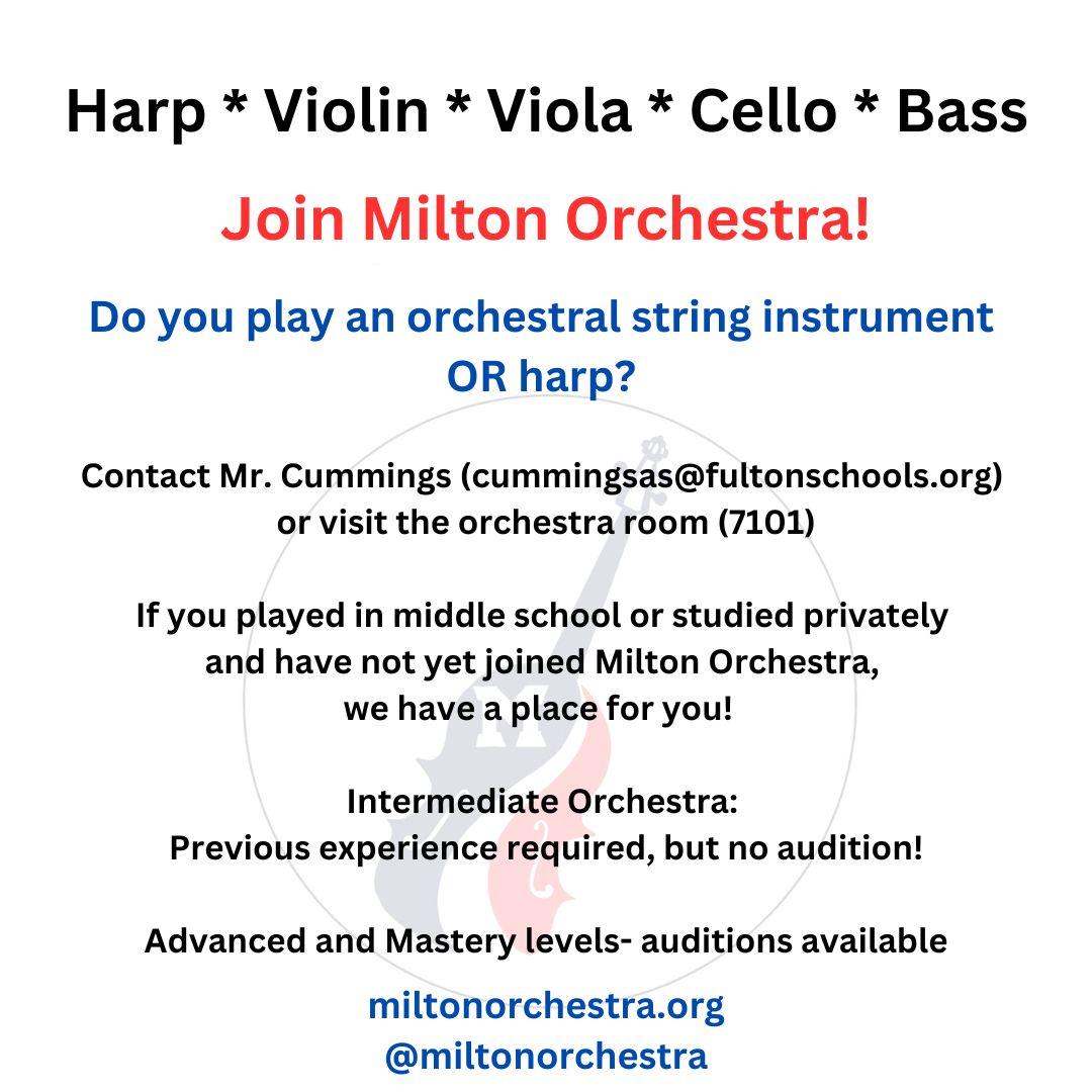 Contact Mr. Cummings (cummingsas@fultonschools.org) or visit the orchestra room (7101) if you have previous experience on any of these instruments and have not yet joined the MHS Orchestra- We have an ensemble to match your experience/interest level!