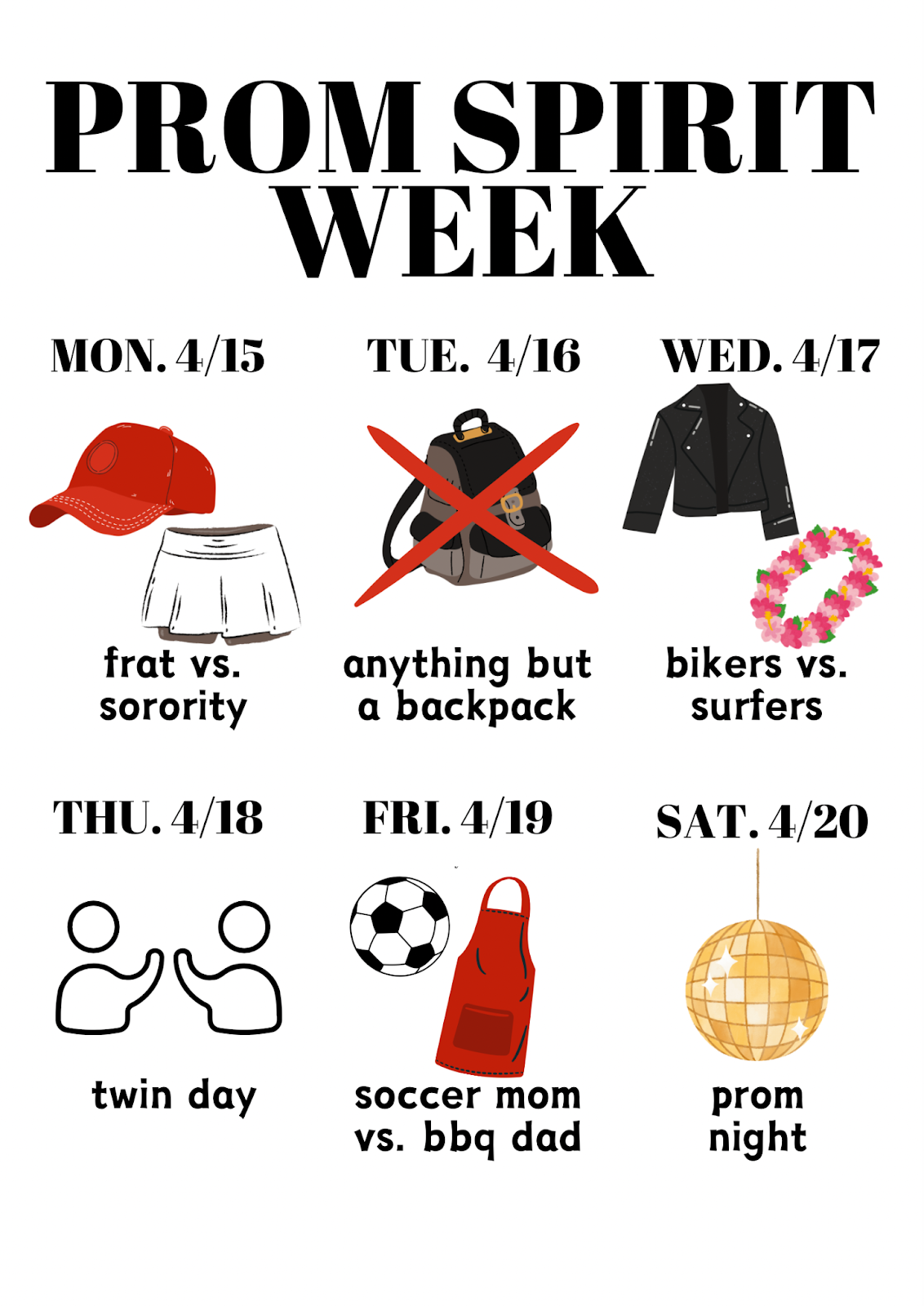 This year's prom, From Cards to Crowns: A Casino Prom Like No Other, is coming up this Saturday, April 20th! To celebrate, there will be a spirit week in the run-up to prom for students of all grades to show their school spirit. Be sure to participate!