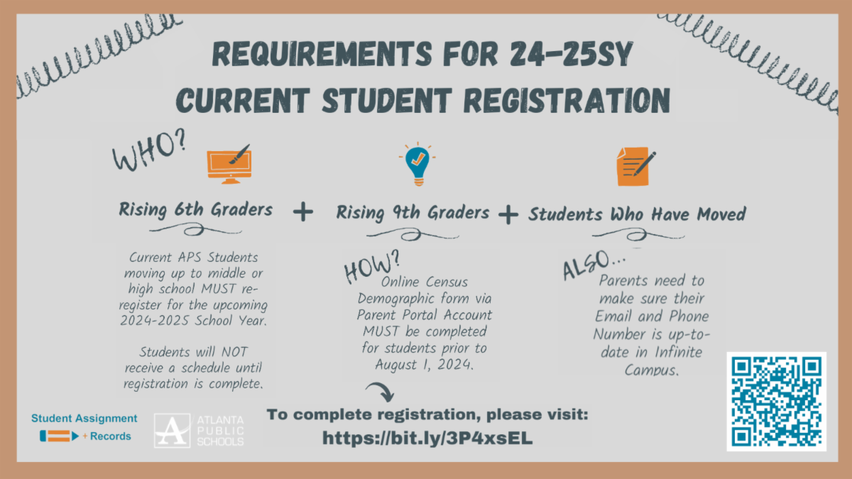 Atlanta Public Schools is in the process of updating student records and pre-registering students heading to the 6th and 9th grades for the 2024- 2025 school year. The APS pre-registration process only requires parents or guardians to register (provide updated proof of residency) when their child(ren) is entering 6th grade, entering 9th grade, is new to the district, is entering kindergarten, or needs to update a change in residency.