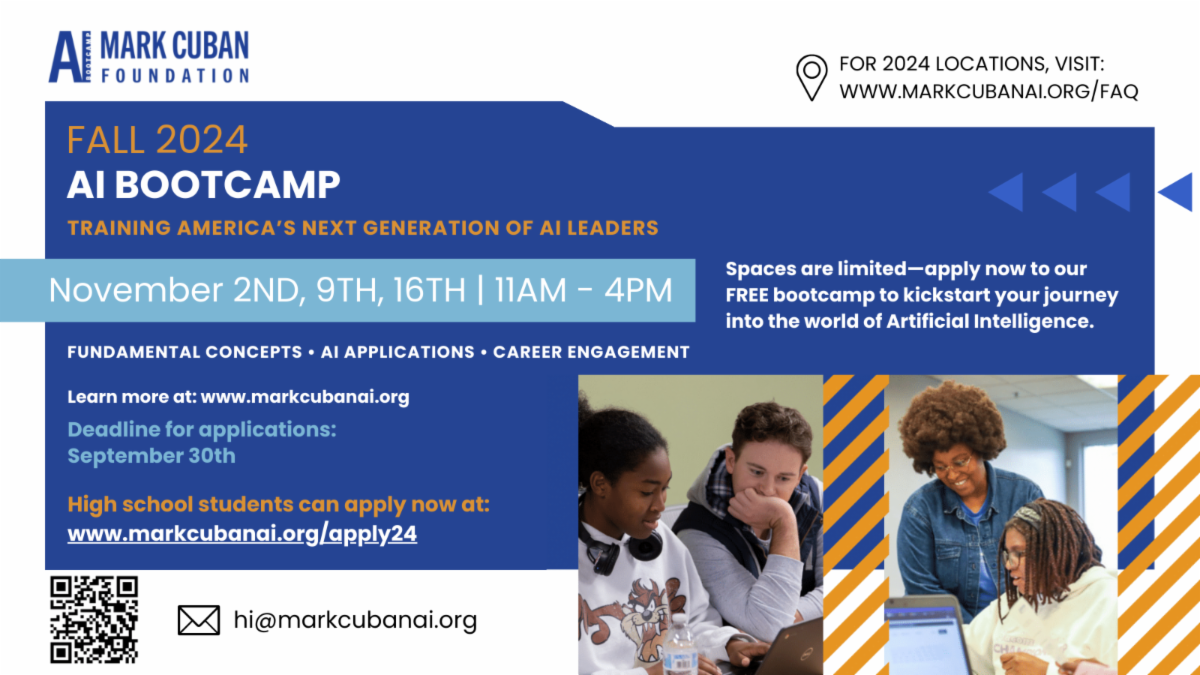 Applications are now open for the November MCF AI Bootcamp Program! This three-day introduction to Artificial Intelligence and Machine Learning will give high school students a deep dive into these emerging technologies, knowledge of what AI is and isn't, where they already interact with AI in their own lives, the ethical implications of AI systems, and much more. Students will learn from industry experts and connect with like-minded students. All camps will take place from 11 a.m.- 4 p.m. local time. Students will be served lunch and snacks. No prerequisite courses or knowledge of coding are required. Apply today by clicking HERE.