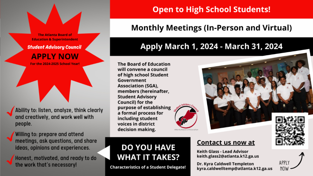 APS seeks 30 motivated high school student leaders to serve on the 2024-2025 Atlanta Board of Education Student Advisory Council. Through the selection process, 15 students will be selected, and school Student Government Associations will appoint the remaining. Candidates need to be willing to prepare and attend meetings, ask questions, and share ideas, opinions, and experiences. The application process is open now through this Sunday, March 31, 2024, and can be completed by clicking HERE.