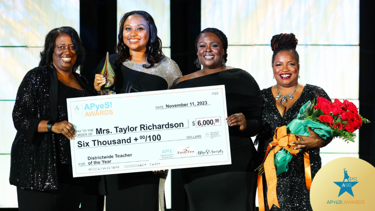 APS Families, please join us in congratulating Taylor Richardson, a 5th-grade teacher at Burgess-Peterson Elementary School, named the APS 2023-2024 District Excellence in Teaching Award Winner (also known as Teacher of the Year) at the APyeS! Awards on November 11!
