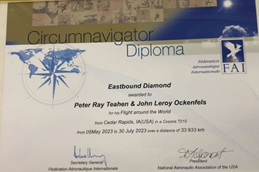 John and Peter had only days before received certification that they had joined the ranks of “circumnavigators.” The elite group comprises only 700 (now 702!) circumnavigators certified by the Fédération Aéronautique Internationale. Their guest, Ed Galkin of Edison, NJ, attended with his wife Bobbie. He is also a circumnavigator, holding the age record for that feat—he was 87 when he set the record.