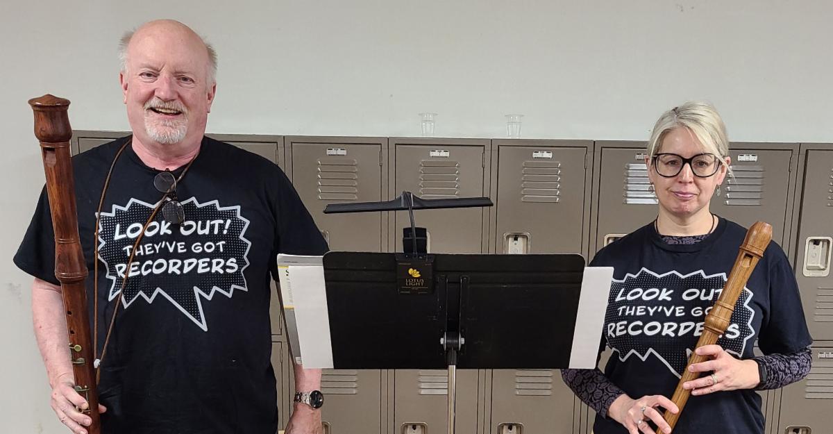 ARS members Bradford Wright and Claire Hartmann-Thompson recently presented a program about recorders (garklein to contrabass) at New Horizons pre-K in Woodbury, MN. Bradford says, "While the recorders would be familiar, our shirts may not be," with their caption Look Out! They've Got Recorders.