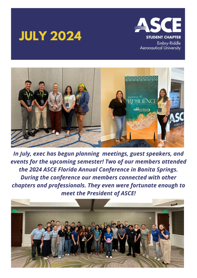 This past month consisted of various events such as team meetings, networking events, the ASCE Florida Annual Conference, and socials. In an effort to inform those curious about the civil engineering profession, we have been conducting Intern Takeovers on the UCF ASCE Instagram page. Throughout the summer, officers and members have showcased a day in the life at their internship and have answered questions regarding their discipline, position, education, and more. We have also gotten a head start in preparation for the Student Symposium by having our first canoe row practice! Officers have met with our Student Government Representative to discuss funding and have also met with YMF to discuss conference prep. Additionally, our 2nd officer meeting was conducted this past month. Officers discussed future General Body Meetings, overall budgeting, tailgating, individual responsibilities, and more. YMF also hosted a unique networking event at Pups Pub where young professionals got to socialize amongst each other while also enjoying the company of their dogs. A major highlight last month was the ASCE Florida Annual Conference. Five of our officers had the privilege of attending the conference and ASCE Florida Section Quarterly Meeting in Bonita Springs. Officers participated in technical sessions where they learned more about different disciplines in the Civil Engineering field.