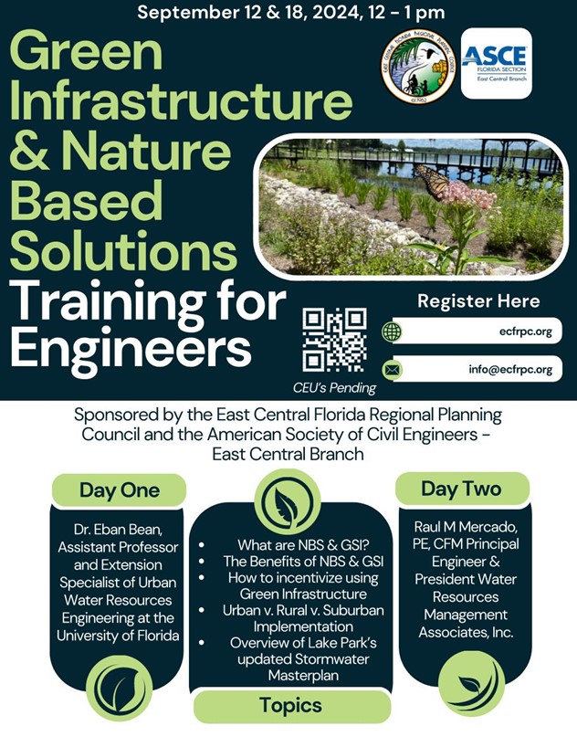 ● September 12th & 18th – 12:00 pm to 1:00 pm – The ASCE East Central Branch Sustainability Committee is partnering with the East Central Florida Regional Planning Council (ECFRPC) to host a two-part webinar training on the topic of Green Infrastructure & Nature Based Solutions Training for Engineers. Each day has been approved for 1 PDH credit. Registration for the webinar series will be coming soon. Click here to view the Speakers' Bios.