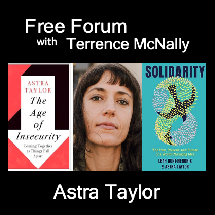 ASTRA TAYLOR was born in Winnipeg, Manitoba, and raised in Athens, Georgia. Her documentary films include What Is Democracy? and Examined Life. She regularly writes for major publications, and her books include Democracy May Not Exist but We’ll Miss It When It’s Gone; Remake the World: Essays, Reflections, Rebellions; the American Book Award-winner The People’s Platform: Taking Back Power and Culture in the Digital Age; and as I said two within the past year, THE AGE OF INSECURITY; and her latest, co-authored with Leah Hunt-Hendrix, SOLIDARITY: The Past Present and Future of a World-Changing Idea. Taylor has toured with the band Neutral Milk Hotel, and co-founded the Debt Collective.