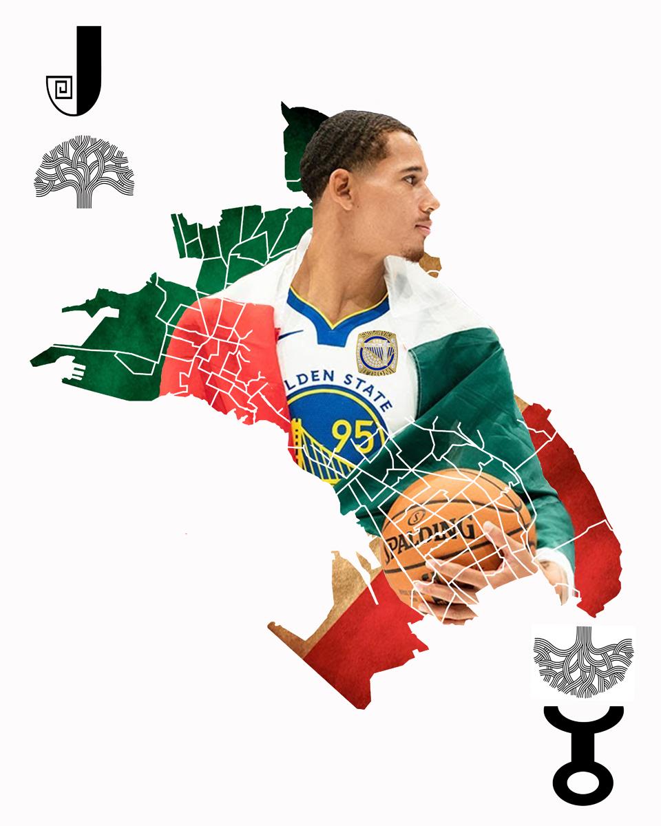 1) In this piece, Juan is shown in front of a map of Oakland, engulfed in district lines. 2) He represents both his Black and Mexican heritage with the Mexican flag he wears on the basketball court. 3) His initials are both English and Wakandan Script from opposite ends like a playing card. 4) His Jersey #95 represents 95th Avenue in East Oakland where he grew up.